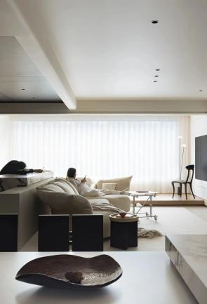 客厅保留了大横厅的空间设计,沙发与吧台水吧相结合的布局巧妙地引入了最大化的自然光线,提升了空间之间的互动性和流动性。朋友小聚,无论是品咖啡还是品酒,都能带来别具一格的生活享受。整体空间设计以黑白色调为主,摒弃了多余的色彩干扰,线条结构简洁利落,既强调了空间的功能性,又恰到好处地保持了克制之美。