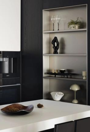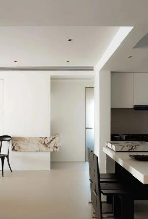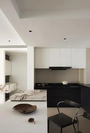 打通了一间卧室,以扩展餐厨区域的空间,同时,强大的收纳柜体有效减少了厨房的杂乱感。独特的金属质感不锈钢展示柜和大理石制成的岛台,不仅可用于有序展示精致的餐具和饰品,更在厨房中营造出一处隐秘的艺术空间。
