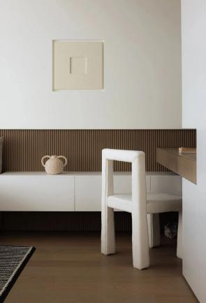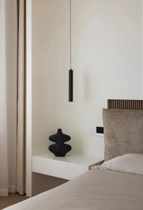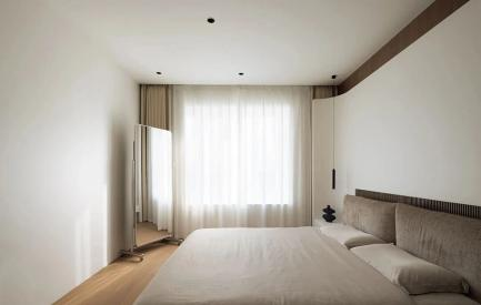 卧室延续公区的极简风格,同时融入温润的木饰面元素,搭配整洁有序的收纳和柔和舒缓的光线以及温馨的软装饰品,床品和窗帘,旨在营造一个平静、温馨、放松的睡眠空间。