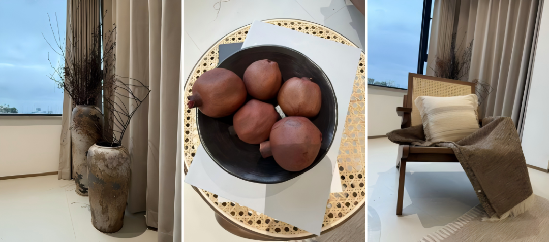 木与微水泥涂料的墙面共同营造自然松弛的氛围,粗陶花器中斜倚着几枝枯木,在光影里诉说静好之美。
