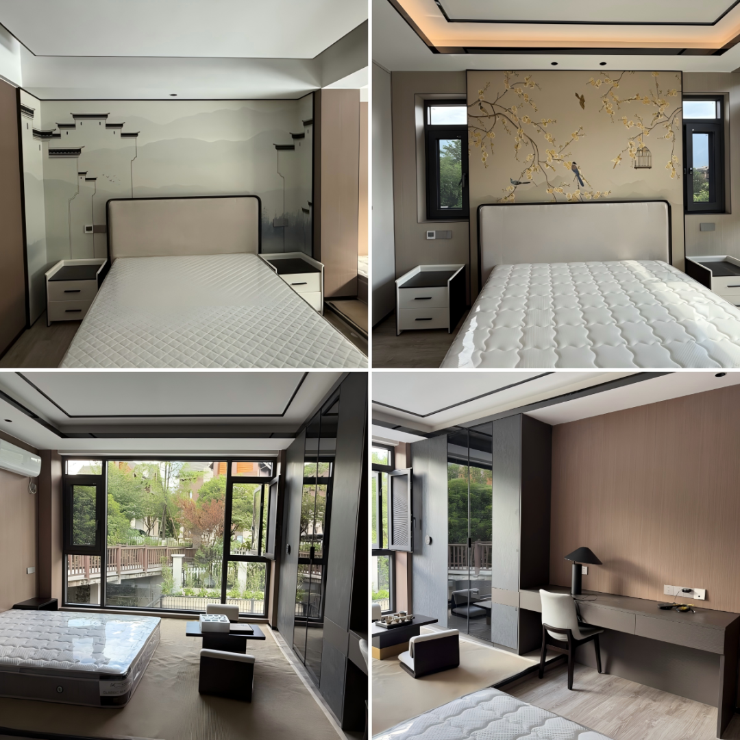 套房空间以圆床打破传统中式空间的方正束缚,用原木、棉麻、云石等天然材质传递舒适体感。借由木格栅、水墨画、等中式元素,勾勒新中式的雅致韵味,让民宿套房既是放松身心的休憩之所,也是感受东方美学的旅居驿站。