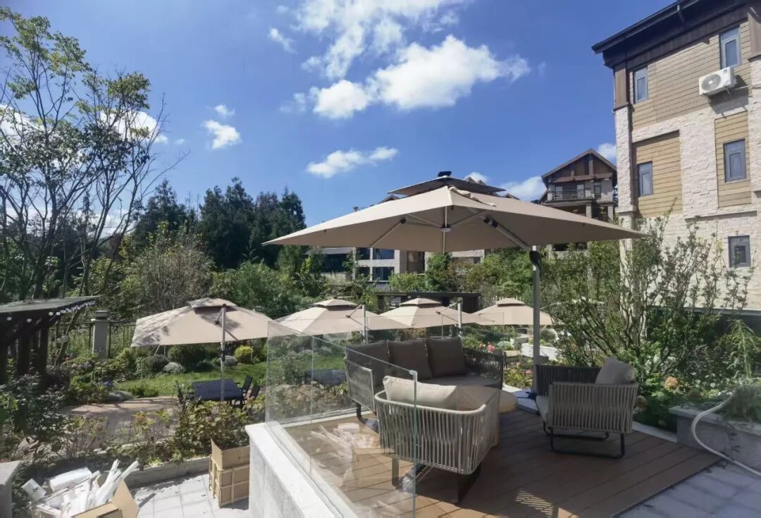 阳光露台,木椅灰伞,与自然绿意对望。庭院深深,白球石径,通往一方静谧天地。