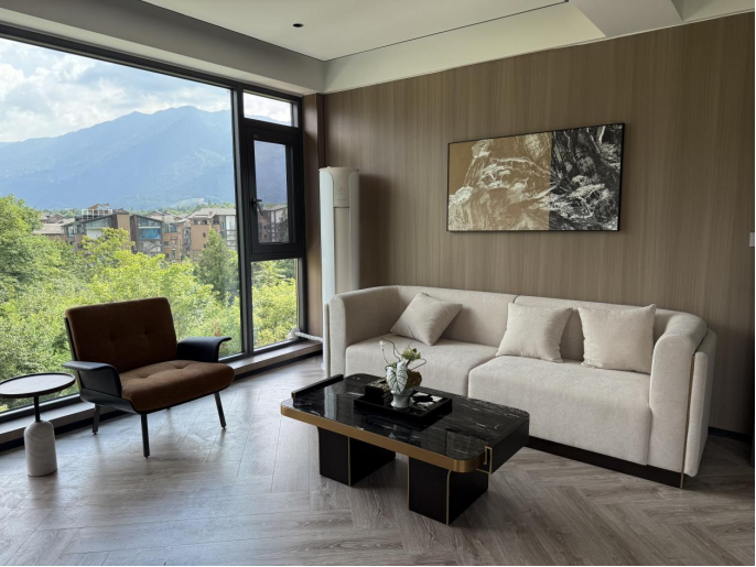 软装设计以峨眉山生态肌理为底,萃取峨眉雪芽、灵猴、云海等在地元素,将山野的野趣与生活的精致巧妙融合,让每一处空间都成为承载仙山灵韵的秘境。