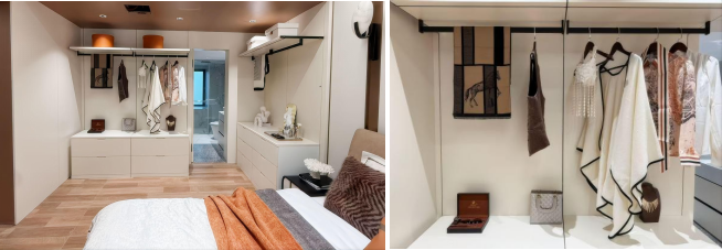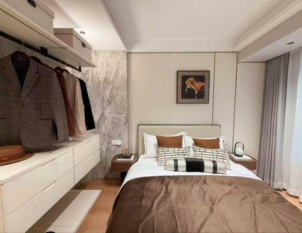 开放式L型衣帽间采用壁挂衣柜,虚实交叠间形成立体视觉效果,衣物收纳一目了然,尽显精致生活格调。