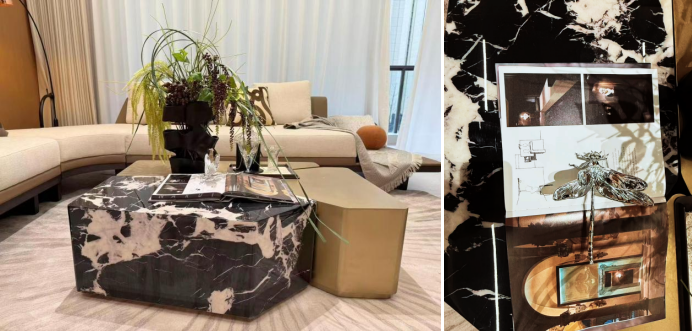 沙发旁,大理石与金属异型茶几堪称点睛之笔:天然大理石的独特肌理与悬浮式金属边框碰撞,冷硬材质中透出轻奢质感,隐藏式收纳设计让美观与实用兼得。
