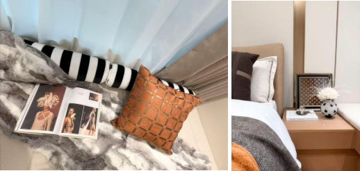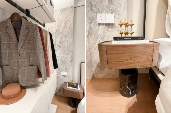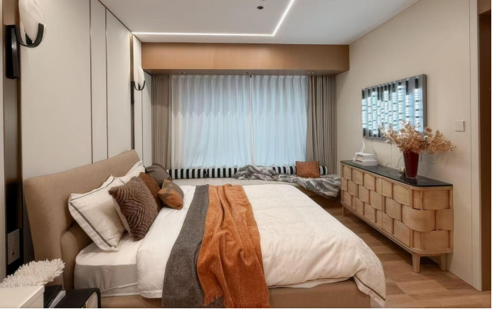 窗边的飘窗设计将胡桃木从窗台延伸至墙面,暗藏式窗帘盒搭配柔光系统,午后阳光透过纱帘洒落,在这里读书、观景,或是单纯放空,都是难得的惬意时光。