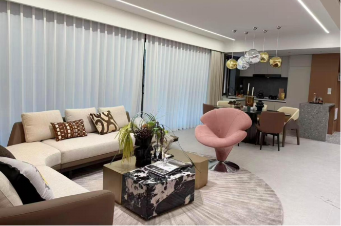 角落里,紫粉色花瓣旋转休闲椅以柔美的线条与浪漫的色彩,打破空间的沉稳,旋转设计增添互动趣味,随手一拍便是ins博主同款氛围感,为客厅注入灵动气息。