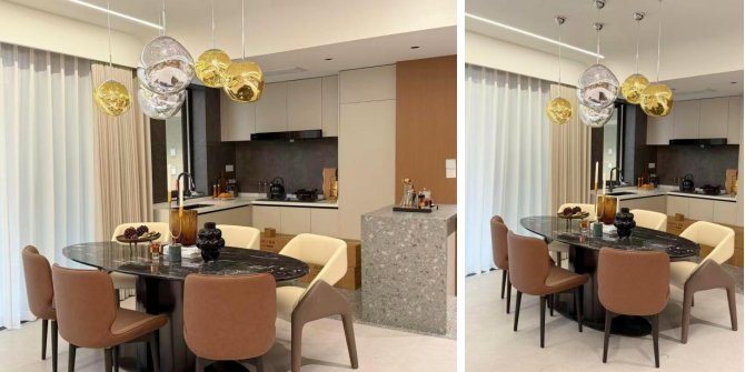 餐厅区域鹅蛋形大理石餐桌以柔和的弧线消解棱角,天然石材的高级质感与整体风格相得益彰,搭配咖色皮质餐椅,柔软的触感平衡了大理石的冷冽。上方悬挂的艺术吊灯,以简约的金属线条与温润的灯光,勾勒出用餐区的浪漫氛围,与客餐厅的木石基调形成巧妙呼应,让浪漫感在空间中自然流淌。