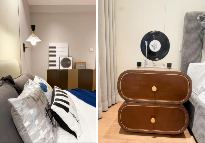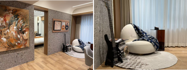 穿过客餐厅,专属的多功能空间以“音乐”为设计核心,成为全家的精神自留地。这里没有繁复装饰,而是以抽象的设计语言诠释音乐的魅力,灵活组合的多功能家具既满足演奏需求,又能变身亲子互动区。