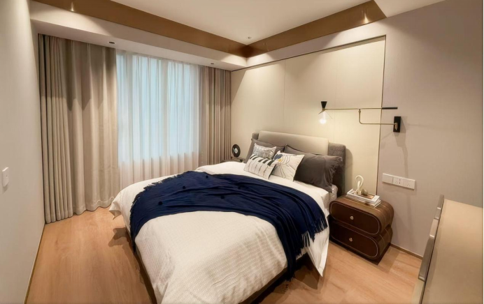 主卧是私藏的静谧天地。柔软的皮质床以简约的线条勾勒出低调奢华,床头背景墙的原木饰面与米灰软包拼接,延续整体风格的同时增添温馨感。