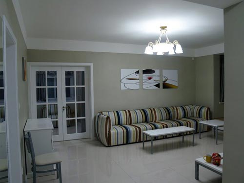 优点:彩色条纹布衣沙发,非常别致,色彩跳跃,使得原本客厅空间顿时灵动起来,轻易抓住人们的视线。墙角线的处理也别具匠心,装饰画也很特别,不是常见的款式,很有sense。