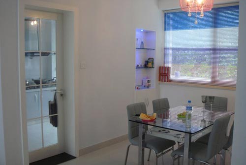 优点:整理搭配不错,与整个家感觉非常搭,百叶窗与餐厅的门也是非常的搭配,选用的灯也是一大亮点,是空间更时尚跳跃。
