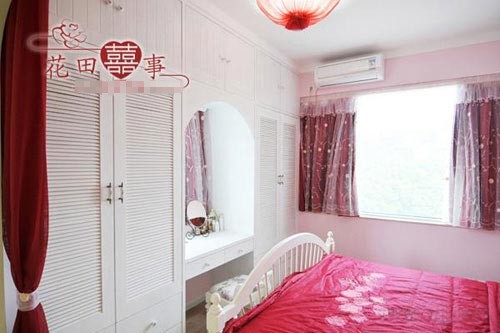 优点:因为这案例是为结婚准备的,所以处处洋溢着婚房的气息,整个搭配,色调选择都非常到位,尤其在细节的处理上更是显示出了设计师的细心,红色的床帘、复古的梳妆镜都让整个卧室显得格外的古典和唯美。