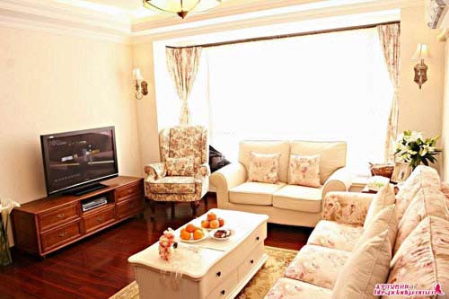 缺点:原木深红地板和电视柜的色调与田园布衣的沙发非常不和谐。