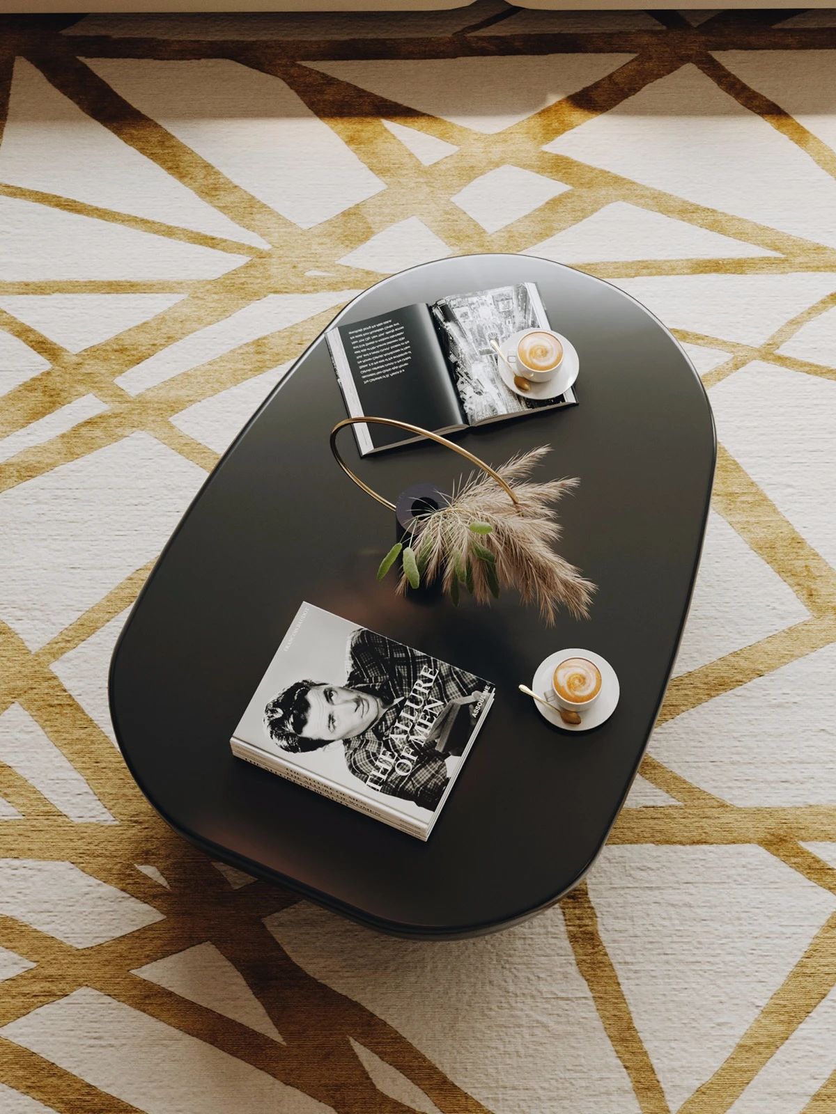 软装设计中地毯上布满了一个十字交叉的图案,就像树的巨大的缠绕在一起的树枝,一个现代的枝形吊灯在上面伸出。