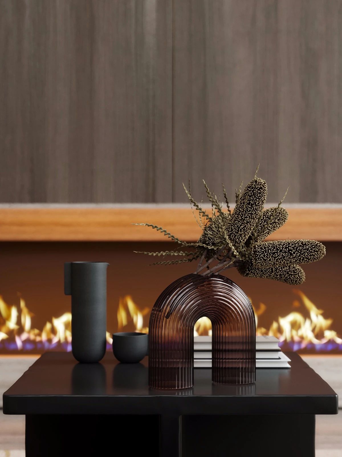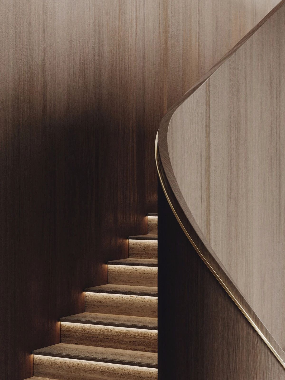 一个镀铜壁炉在胡桃木媒体柜下发出一个奢华的音符。楼梯的设计采用螺旋形的栏杆,与胡桃木扭曲的树干相协调。卧室吊灯,壁灯和床头灯带来了丰富的金色口音,在独特的石灰华床头板上闪闪发光。