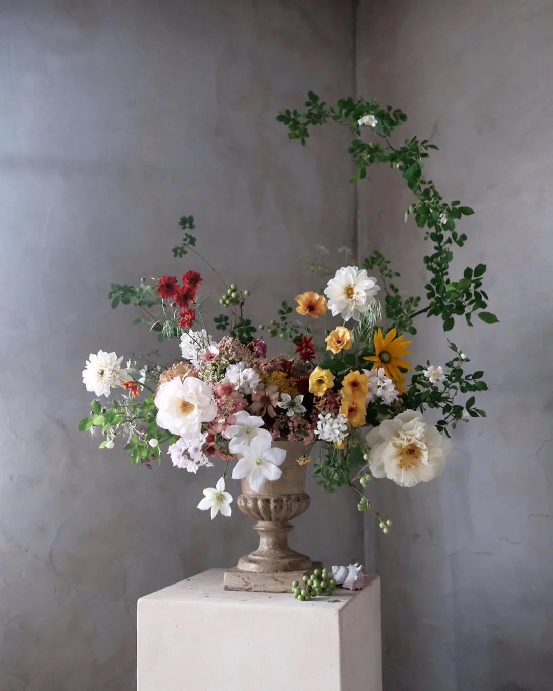 2.插花时使用的花材种类太少,容易让作品显得呆板、没有变化性,但并不是说把一堆花材一股脑地放到作品里就是好的,在有限的插花区域里使用风格不一致的大量花材,很可能让作品显得凌乱无章法。