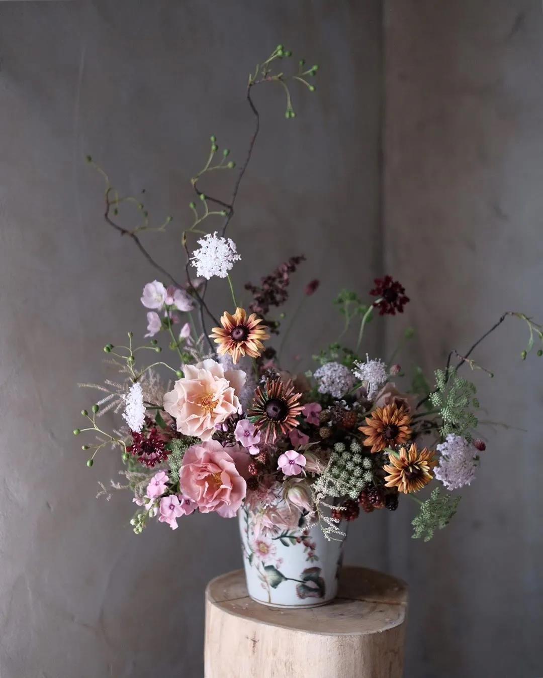 所以在插花时,你要根据容器的大小、风格、插花使用的环境来有取有舍地选择插花时要用到的不同花材类型。