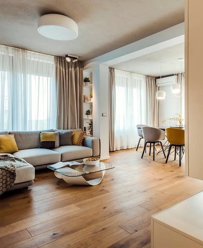 客厅是整个家居环境的体现,主要承担着会客和娱乐休闲的功能。如果经常在客厅里看电视,那么客厅的光线就不应该太强,建议选择具有挡光、隔热功能的厚棉麻或涤纶材质的窗帘。