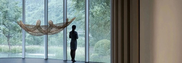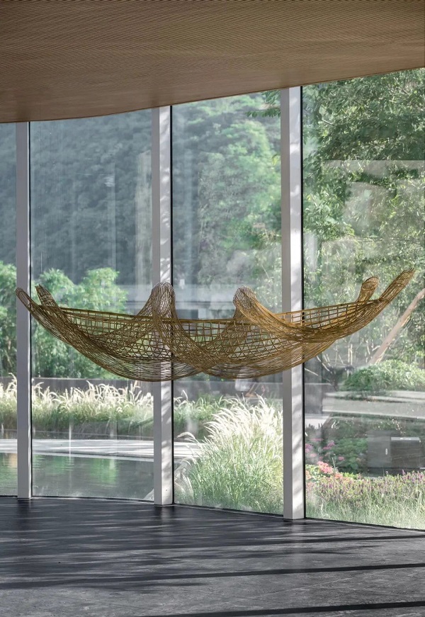 有感于这样的民风与自然,明德设计提取当地非遗文化——“竹编”手艺作形式演变,赋予器物以“帘”、“篮”、“笼”多种形态,并作为空间人文精神串联的元素存在,将传统东方元素与当代设计表现相融互生,令空间隐含着地域的文化历史与自然风貌,亦衬托着淡雅和煦的调性。