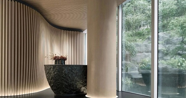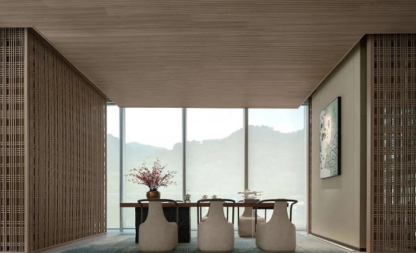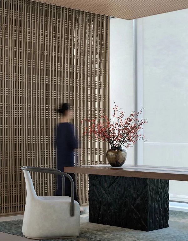 空间的整体设计以现代自然的表现手法,重塑城市与自然、生活、人之间的相互关系。竹木色为主调,沙发、单椅、地毯着色象牙白、麻灰与青碧色作为点缀,共同营造一种清逸和雅的山居美学。竹木格栅为空间构设丰富的节奏感,细碎的阳光穿透过格栅的细孔,洒在木的纹理、花瓣与枝枒上,抒叙着光影与自然山水、与空间美学之间灵动的故事,清和、高远的在地人文精神在此复现,浸润人心。