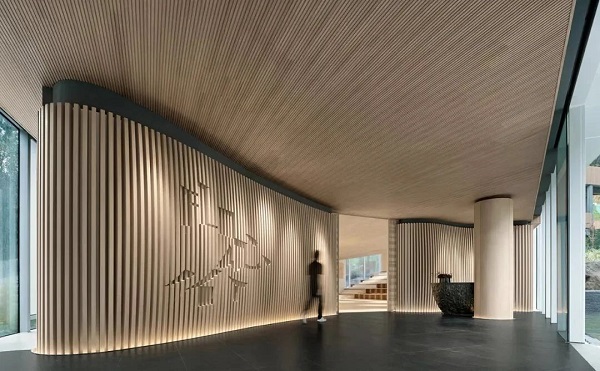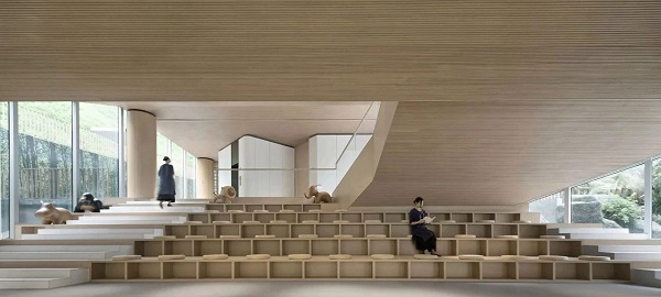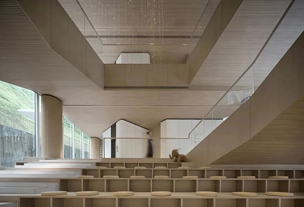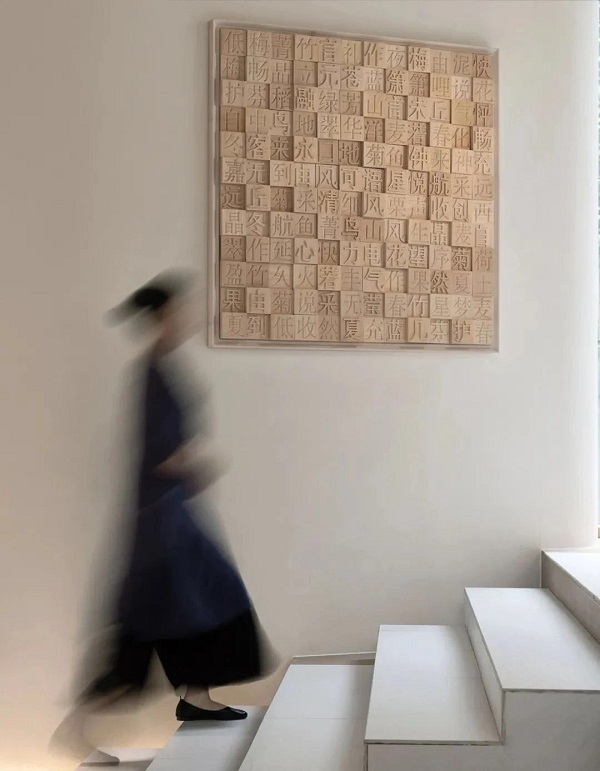 设计于楼梯之下的空白处,另辟出一隅阶梯架空层,以作为开放的活动场所。木艺的体量感、体块层次、朴拙韵味,伴随层级上的视觉延伸,于雅澹之境中生发出清朗澄净的美学观感。