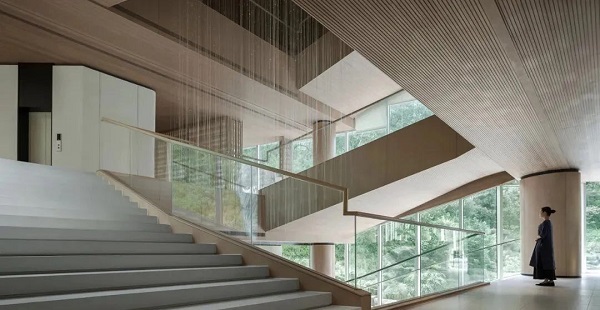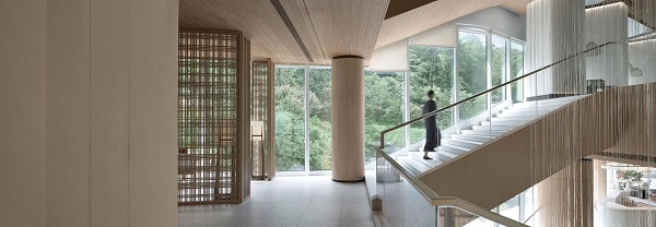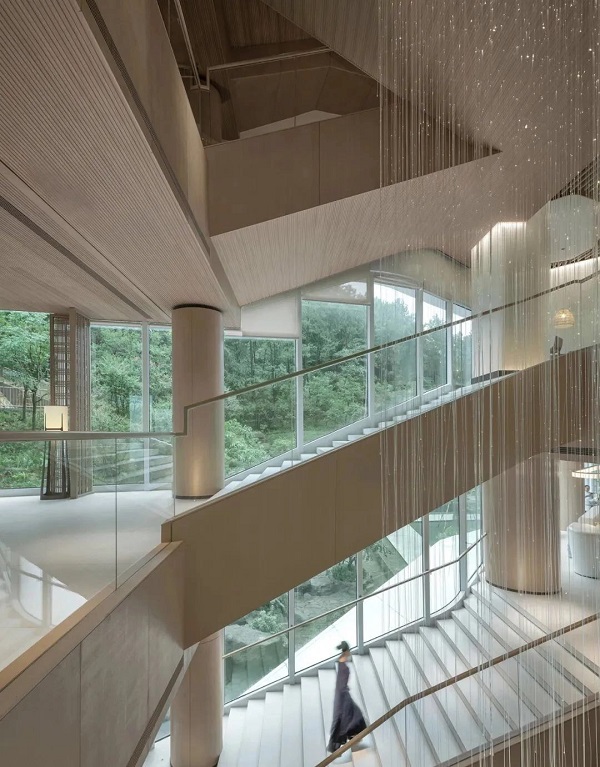 拾级而上,仰视间可见轻盈细软的灯饰,指引着空间精神向上,如虚若影。其间的流光溢彩如同洒满日光的水流,化作自然的艺术手臂,写意澄澈清朗、幽和尔雅的诗境美好。