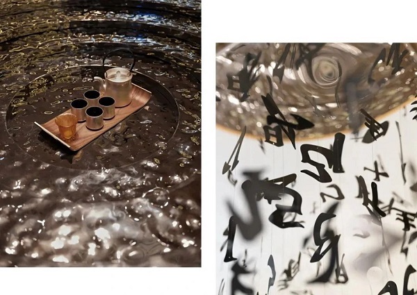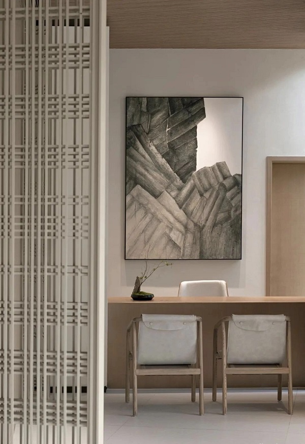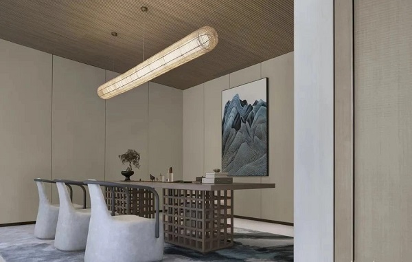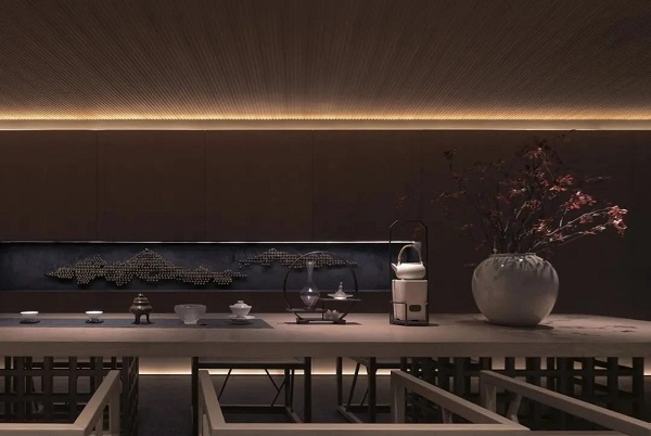 纸质的灯饰轻且雅,茶汤的清香浸润着空间诗意,水墨画将空间的人文情愫带入更高远的境界中,文人雅士的情怀自空间细处弥散而出,带予人一种出世的旷达与恬淡。