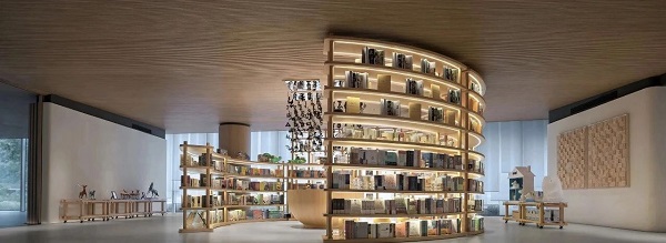 循着木墙的肌理,可来到视效宽阔的书吧区。空间中央以层次丰富的曲型书架围合,整齐陈列的图书绘本、徐徐垂下的汉字吊饰、清冽雅澹的水景茶汤……共同构筑起一隅精神丰赡的人文世界。