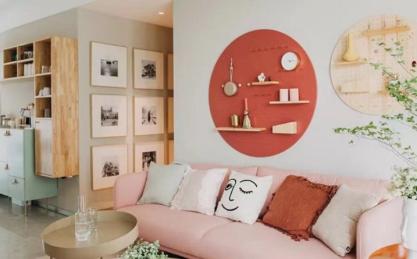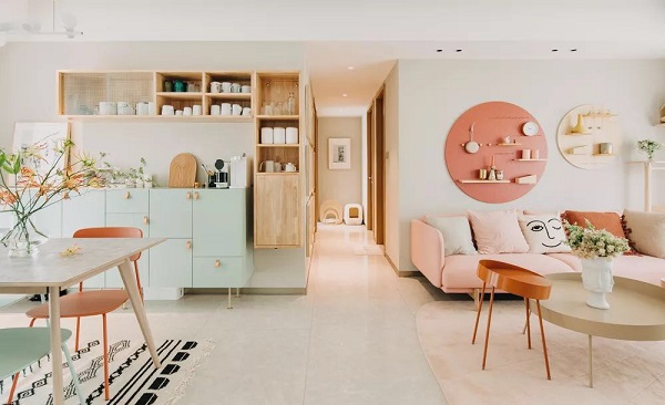 因此,在设计全屋时,设计师选择了与原本米灰色墙体带有同样黄色调的橙粉和灰粉绿作为软装的主配色,让空间更终呈现的色彩可以更好地融合,也能让屋主内心深处的少女心得以释放。