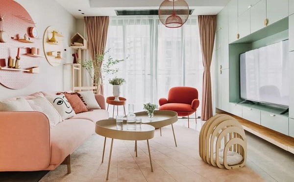 客厅通向阳台,白天采光充足。在橙粉+灰粉绿为主色调的空间里,米黄色起到了很好的过渡作用。