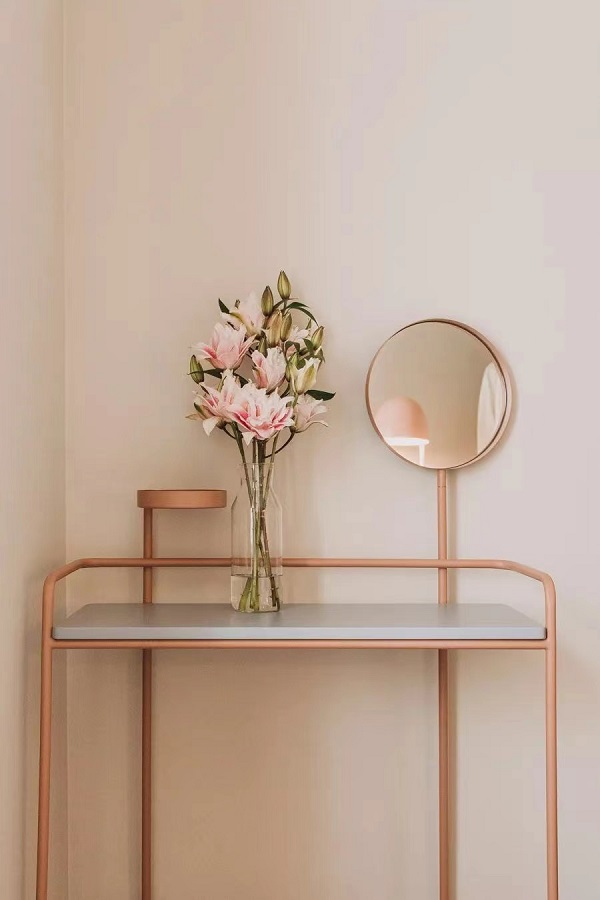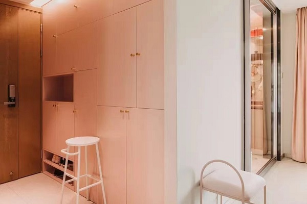 玄关处,软装设计师利用墙体的厚度,定制了一整排内嵌置物柜。颜色是设计师调制的,软软的粉色,让屋主一进门便能感受到温柔。