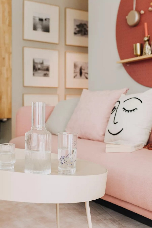 条形的粉色沙发长约两米,足够让人舒服地躺在上面放松全身。通往卧室的走廊墙面,索性做成了一整面照片墙,屋主觉得这比购买来的挂画意义更大。
