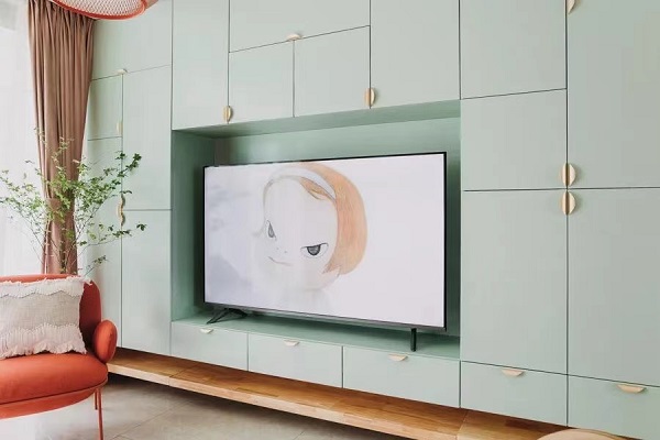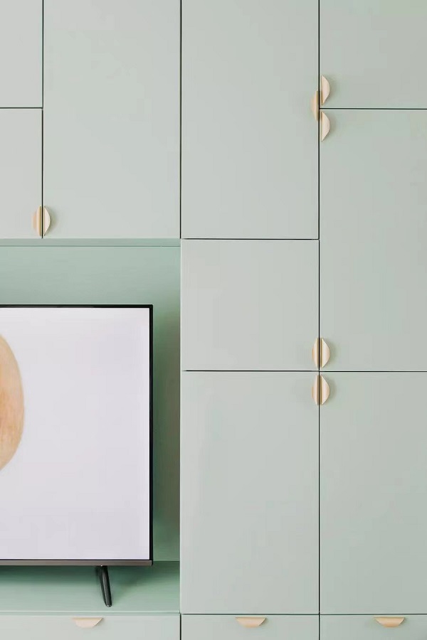 电视墙一侧定制了一整面不规则开门的电视柜,材质是烤漆多层板。柜门不同的开合方向,符合人体工学的需求,也与屋主家具可以设计有趣一些的期望达成一致。