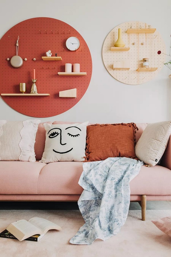 沙发墙一侧,定制的两块洞洞板既可装饰墙面,又能轻松置物,两块板的颜色和沙发、靠枕的颜色呼应。同一个色块区,通过不同材质和颜色深浅也可营造出丰富的空间层次哦。