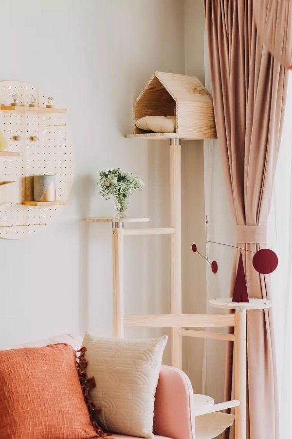 家有爱猫,自然少不了为它打造一个游乐场。但因猫的喜好时常变化,所以没有做固定的活动板,而是在客厅一角放置了一些可以随时更换的猫爬架,这样更符合猫的习性。