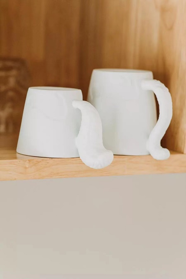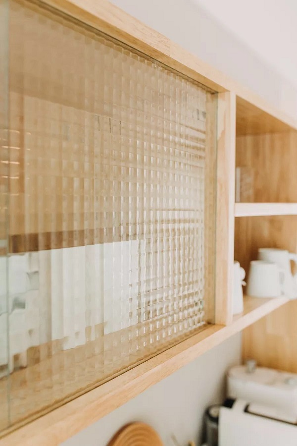 吊柜主要用于收纳屋主的几十个杯子。相比全透的玻璃推门,马赛克纹理的半透明设计更有一种若隐若现的美。猫尾巴造型的杯把手在不经意间体现了屋主的童心呐。