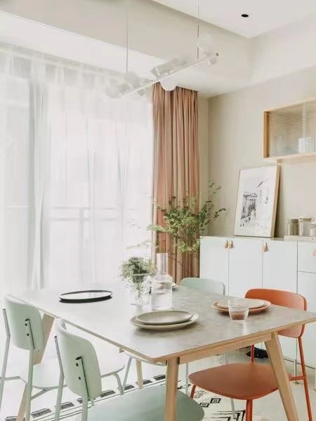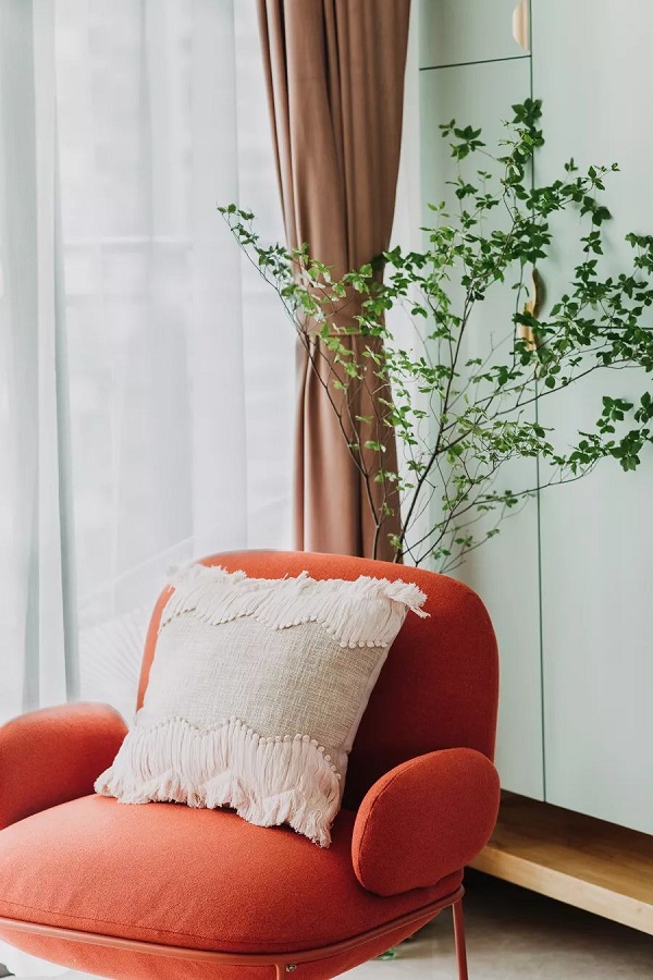 关于餐椅,有个很神奇的小插曲。设计师是在挑好柜子颜色后才去选的餐椅,没想到找到了和柜子颜色几乎一致的椅子,人生处处是小惊喜呀。唯一一把橙红色的餐椅担当了点缀的角色,也呼应了客厅的橙粉色调。