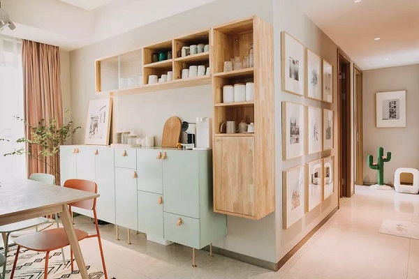 餐厅的地柜颜色和电视柜呼应,柜门也同样采用了不规则设计,让屋主在打开柜门时收获惊喜。