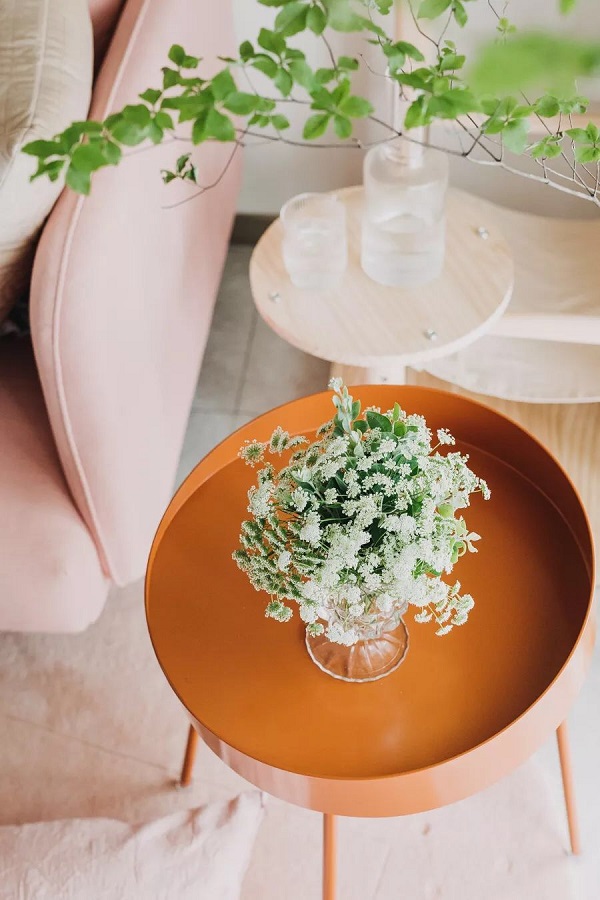 铁艺圆几代替了传统造型的大茶几,与空间整体的轻盈感吻合,并且兼具实用和美貌,也更为轻便。
