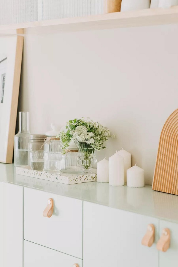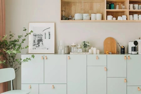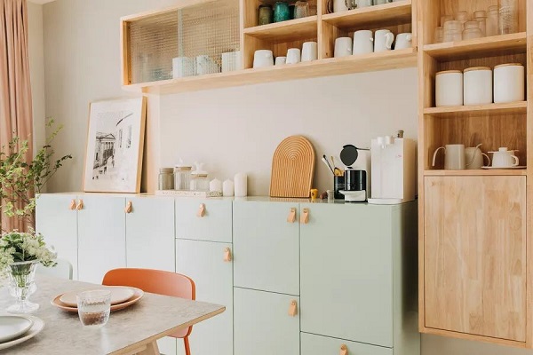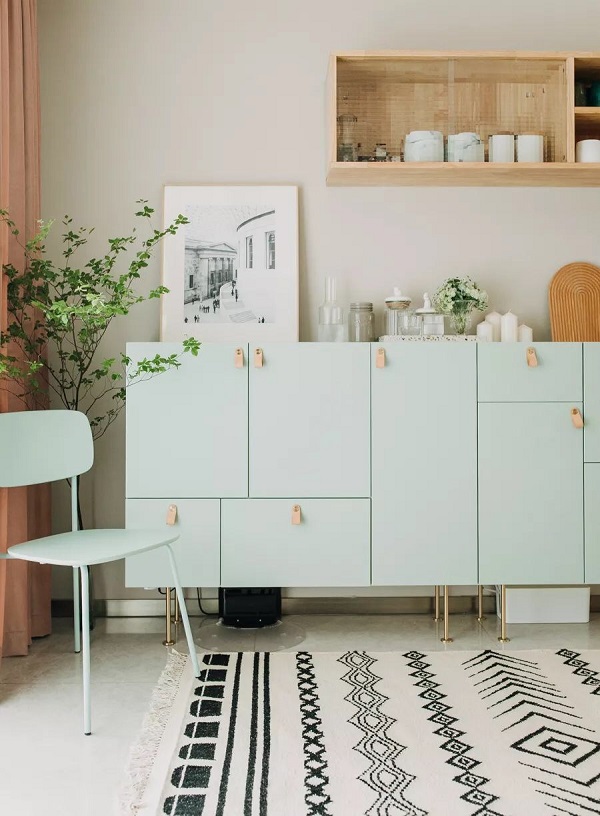 餐厅的主色调是灰粉绿和原木色,清新得仿佛置于森林之间。考虑到屋主钟爱的不规则设计,墙上的吊柜设计成了L形,打破了固有的横条造型又不会过于奇怪,同时与地柜摆放的角度形成了视觉互补,避免了突兀感。