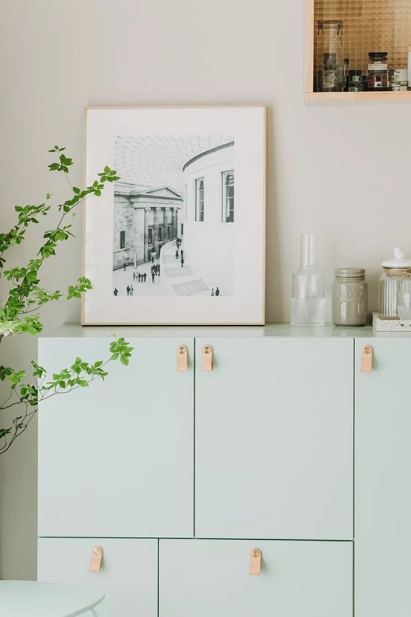 柜门把手的材质是牛皮的植鞣革,柔和的原皮革色和上方的原木色融合在一起。