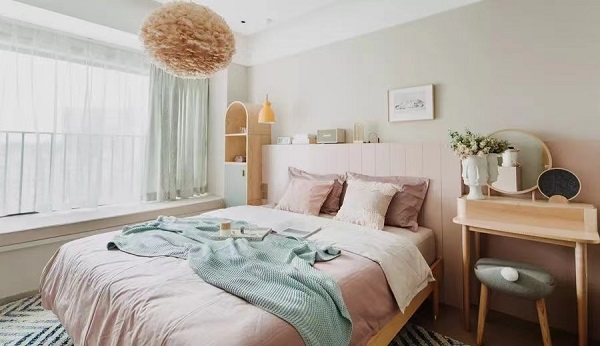 粉红色的主卧让屋主完全卸下了心防,一盏同色系的羽毛顶灯,少女感十足。