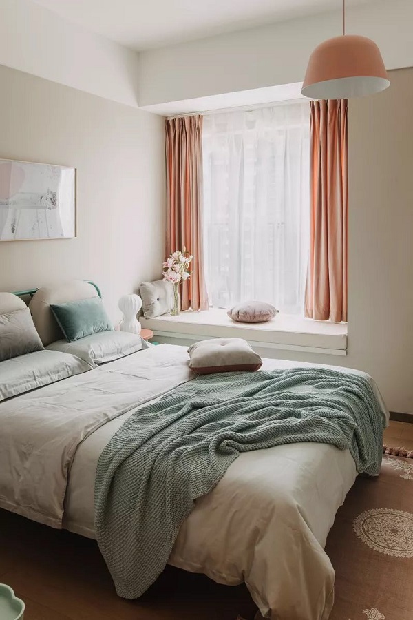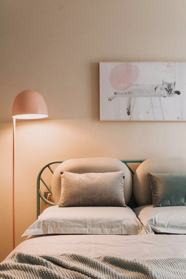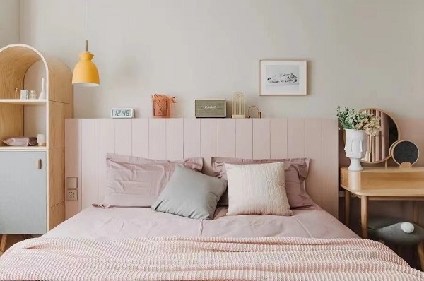 定制的粉色床头板改善了墙面的单调。板子颜色也是设计师自调后交给工厂打样,反复几次才确认的。