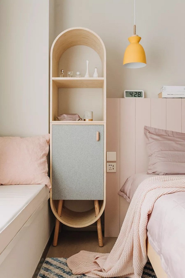 另一侧的床头柜,造型也不是那么的中规中矩。一盏橙黄色的小吊灯方便屋主在睡前阅读。床头板上安装了插座,还有USB接口设计,这些小细节太贴心啦。