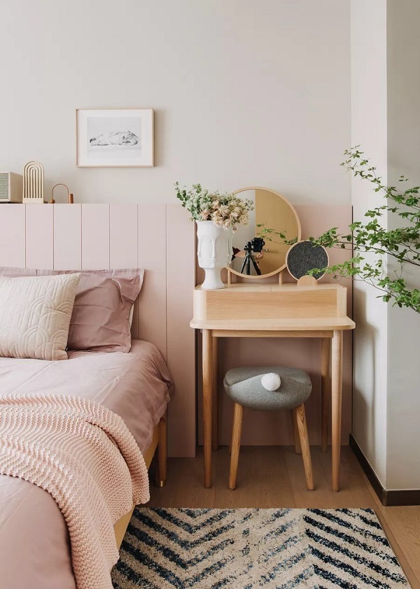 床头一侧放置了梳妆台。梳妆凳上有一个类似兔子小尾巴的设计,给这个空间增添了几分童趣。