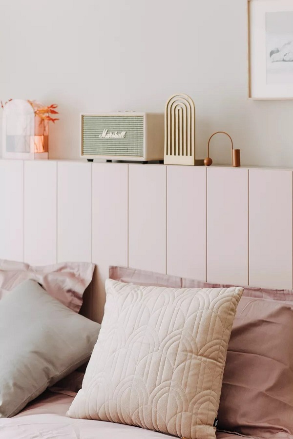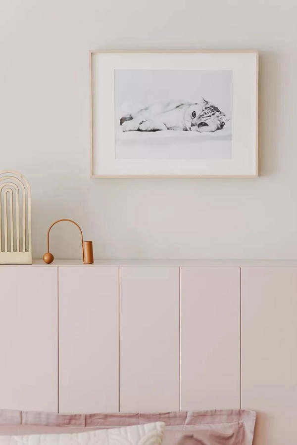 床头板上的空间可放置一些助眠物品,比如音箱和拱门造型的小烛台。墙上挂着屋主的爱猫照片。