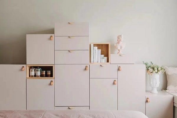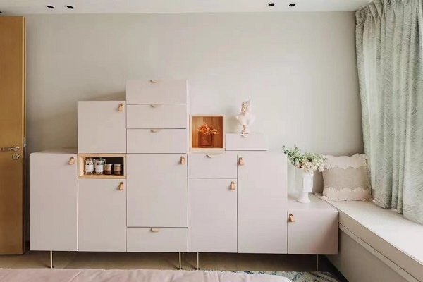 柜体下方的木隔板,在满足收纳功能的同时,也缓解了整面墙柜带来的视觉压迫感。