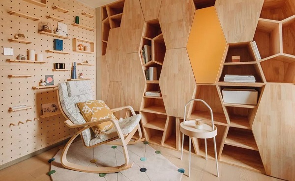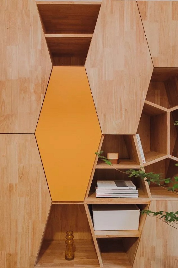 书房的整体色调以暖橙色为主。书柜的蜂巢样式是设计师和屋主在某次聊天中定下来的,屋主很喜欢,设计师便为她复刻了一个。