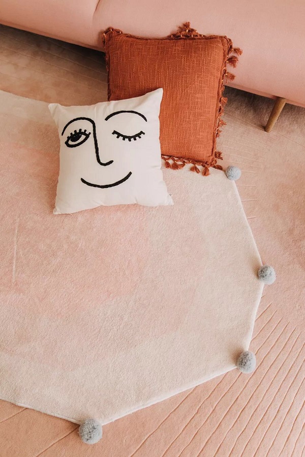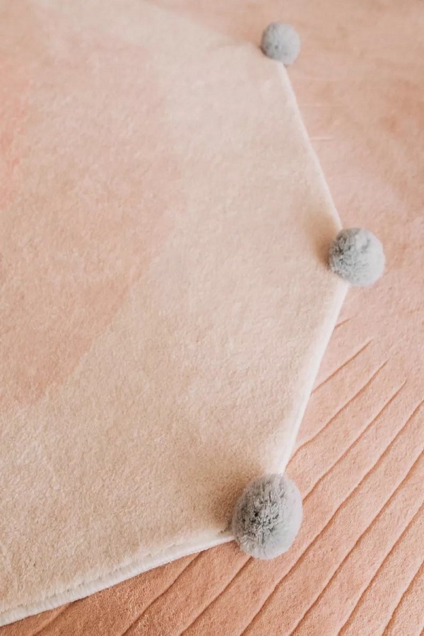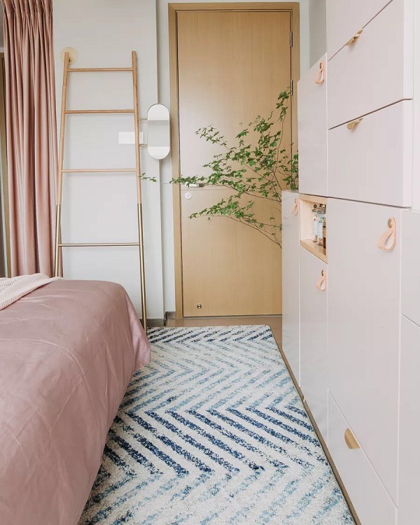 鱼骨纹路的蓝色大地毯,可以中和粉红色的“腻”。